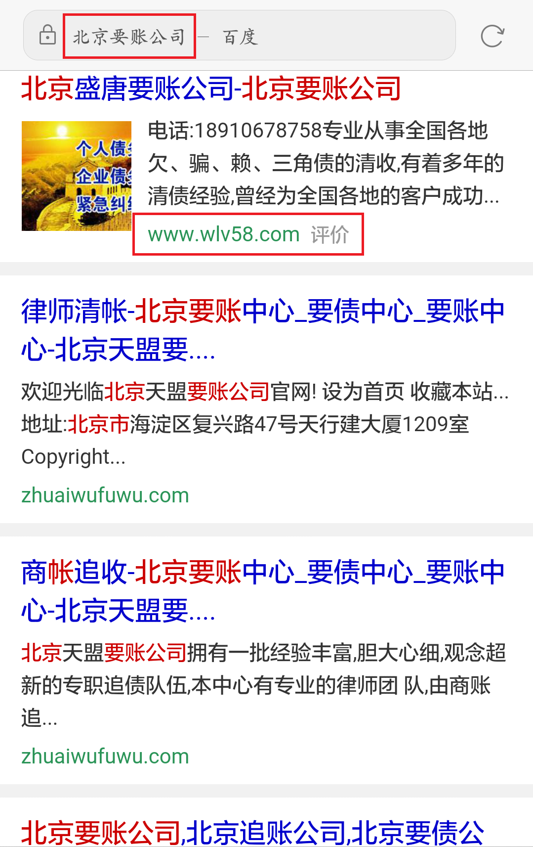 我们北京SEO优化最近与北京一家要账公司进行合作,并且我们了解到,现在市场中由于知道了解贵公司的朋友并不是很多,所以贵公司需要我们的帮助,委托我们为贵公司的网站http://www.wlv58.com/进行做一次网站优化。而且是移动端排名,因为生活中每个人都有手机,所以做移动端是非常有使用价值的,如今我们已经成功的将关键词“北京要账公司”做到移动首页,下面我们一起来看一下成功的秘诀吧。